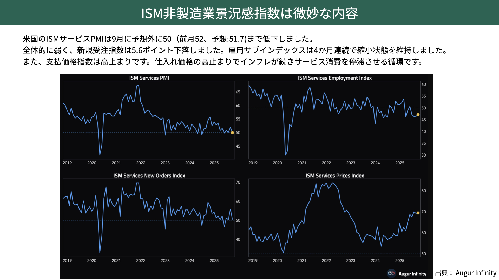 特に新規受注は5.6ポイント下落し、かなり新規受注が減っています。雇用はやや持ち直しているものの、依然として50を下回っています。プライスペイドは製造業とは異なり、高止まりしている状況です。こうした点を踏まえると、かなり微妙な内容だったと言え、こちらも景気の良し悪しを判断するのは難しい水準です。