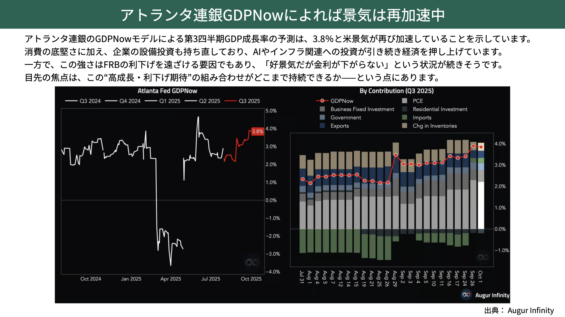 現在、市場では10月に利下げが行われる可能性が高いと見られていますが、こうした強い経済指標が続けば、いずれその前提が揺らぐ可能性もあります。高成長で利下げ期待という組み合わせがどこまで持続できるかは、GDPNowが強ければ強いほど、課題としてテーマとなる可能性があることだけは注意する必要があります。