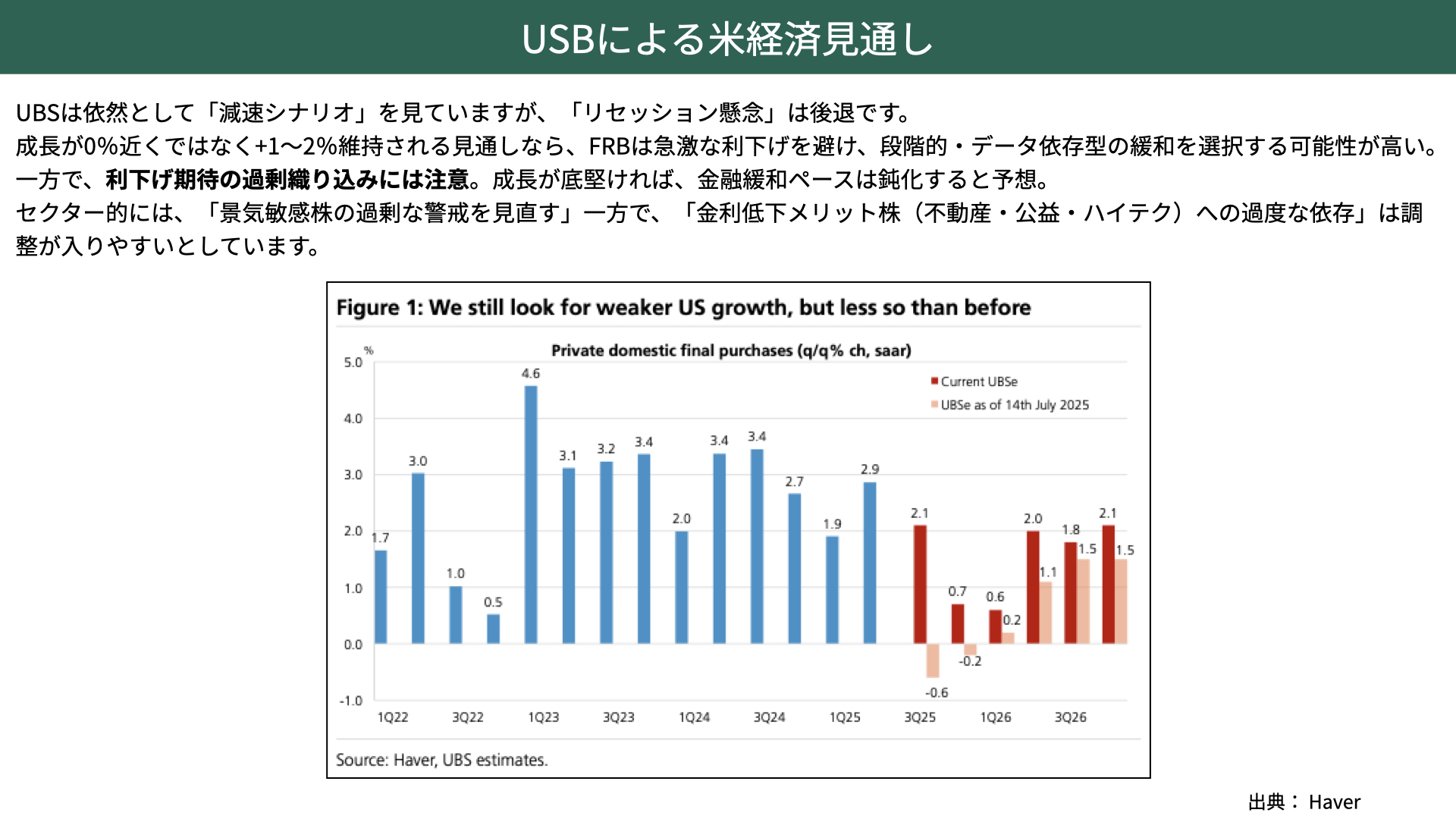 下の図表をご覧ください。赤い棒グラフがUBSによる成長率の予想です。2025年第3Qは+2.1%、第4Qは関税の影響が少し出てくるものの、それでも+0.7%とプラスを維持。2026年第1Qも+0.6%、以降も+1.8〜2.1%と、堅調な成長ペースに戻ると見込んでいます。