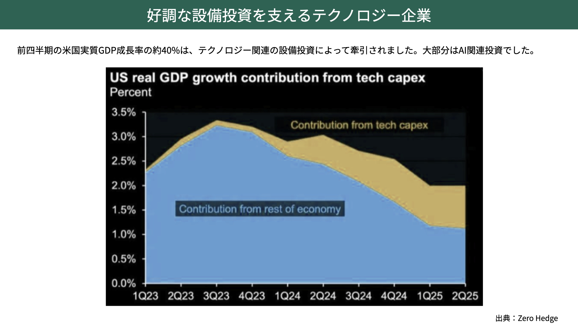 GDPは非常に堅調です。こちらは、前四半期の米国実質GDP成長率です。どの分野が成長を牽引しているかというと、テクノロジー関連企業の設備投資が大きく寄与しています。直近では、全体の成長のうちおよそ40%がテクノロジー企業による設備投資、特にAI関連分野への投資に支えられていることが分かります。