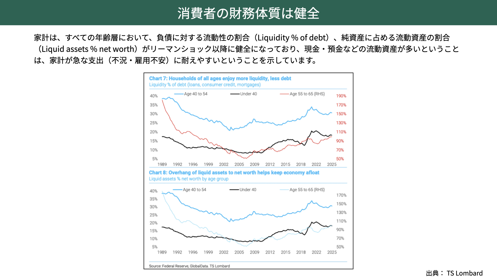上のグラフは負債に対する流動性の割合、下のグラフは純資産に占める流動性の割合を示しています。2008年のリーマン・ショック以降、40代~65歳までの流動性が高まっているのです。