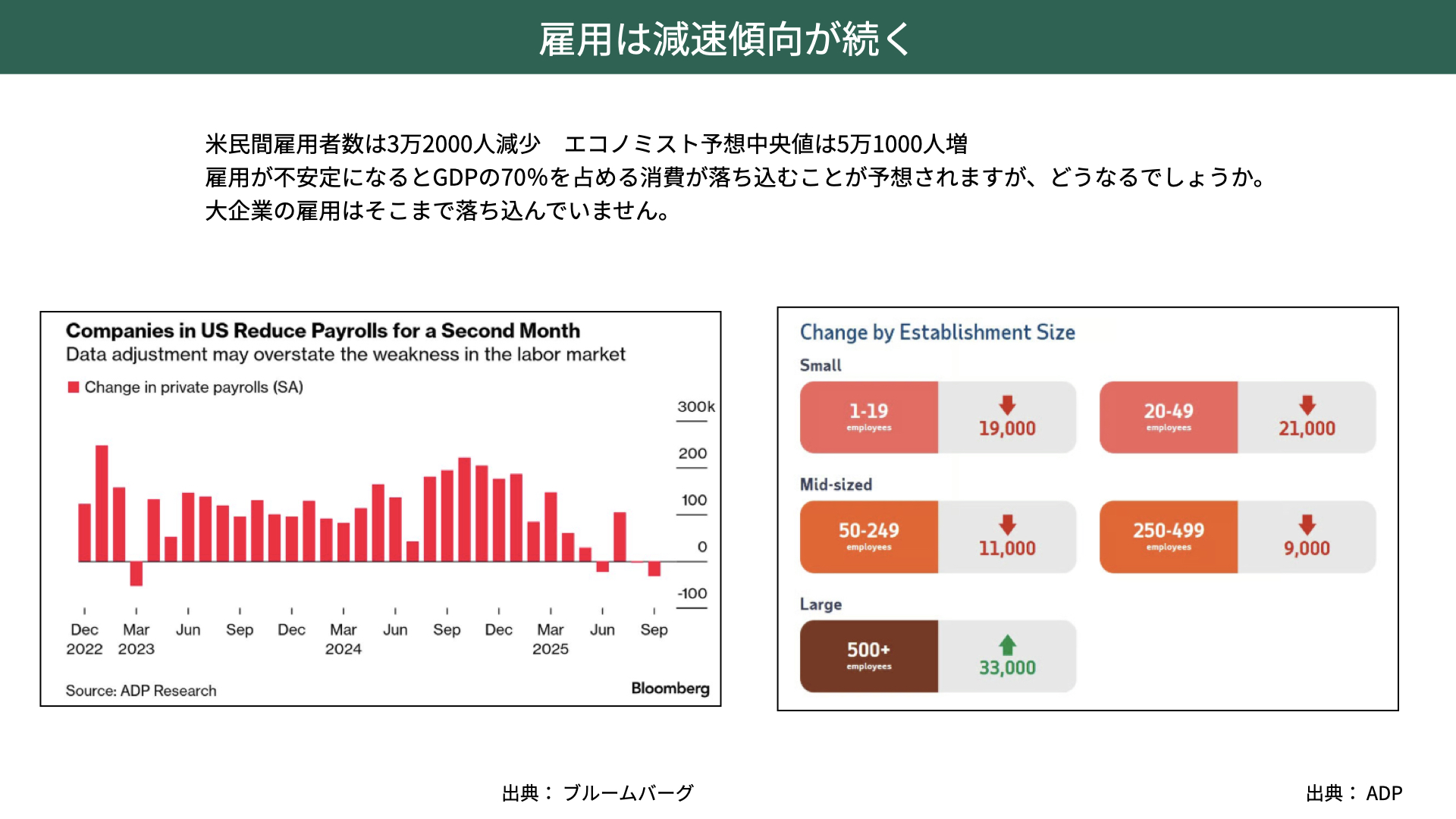 こうした雇用の悪化があれば、消費が落ち込むのではないかという懸念が出てきます。しかし、ADPの内訳を詳しく見ると、大企業では雇用が増加している一方で、中小企業以下で雇用が減少している構図が見えてきます。