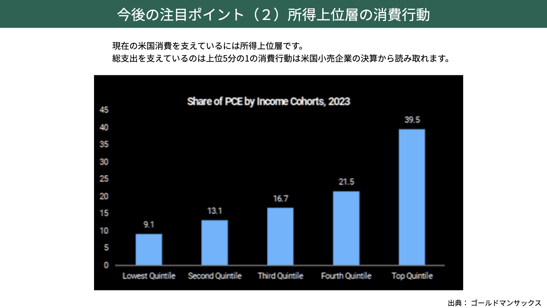 これがどう消費に影響するのでしょうか。アメリカでは、所得上位20%が米国消費の約39.5%、4割近くを担っています。上位40%まで範囲を広げると、消費の約6割を占めています。