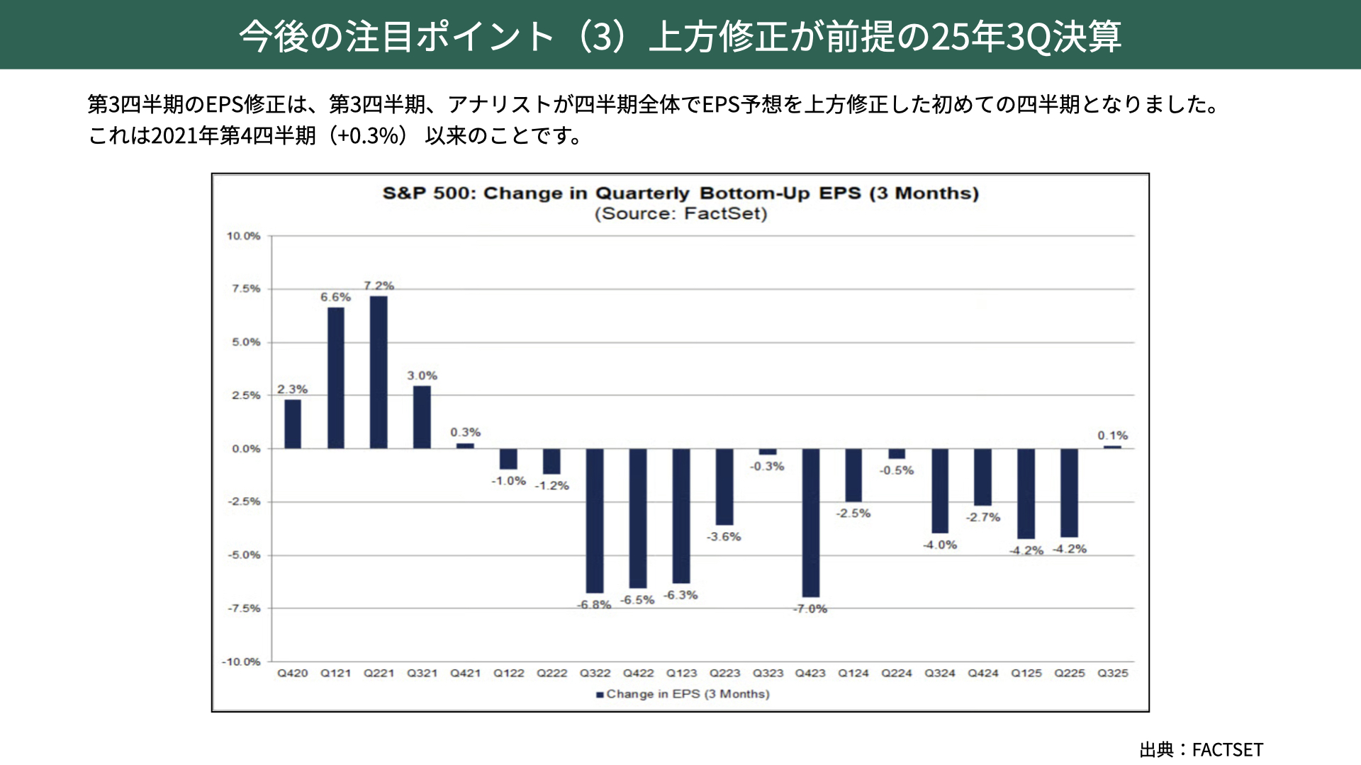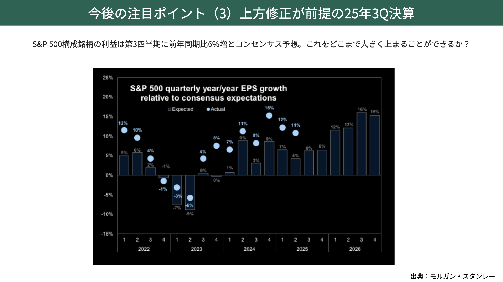 マーケットのコンセンサスとしては、2025年第3QのEPSは6%の成長を見込しています。第1Qは予想+7%に対して実績+12%、第2Qも予想+4%に対して実績+11%と、共に5ポイント以上も予想を上回る結果になっています。今回は6%の事前予想ですから、2桁成長が期待値としてある中で、どれだけEPSを伸ばせるかが注目されるポイントです。