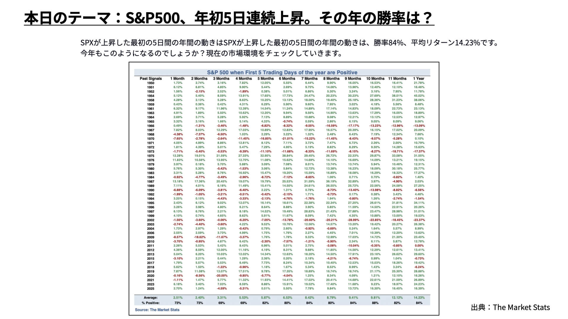 今年に入り、S&P500が年初から5日連続で上昇しています。過去の統計を見ると、年初が好調な年の1年間のパフォーマンスは、勝率が84%、平均リターンが14.23%です。