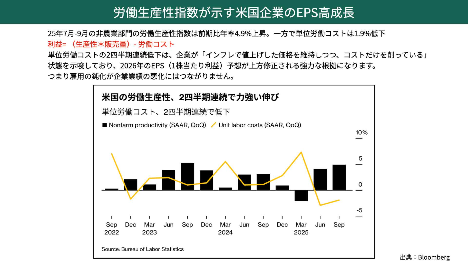 「企業の利益=生産性 × 販売数 − 労働コスト」を考えると、26年の企業EPSは、インフレで値上げした価格を維持しつつ、コストが削れている、もしくは抑えられている状況です。26年のEPS予想は上方修正されるような、強力な根拠になるのではないかと思っています。
