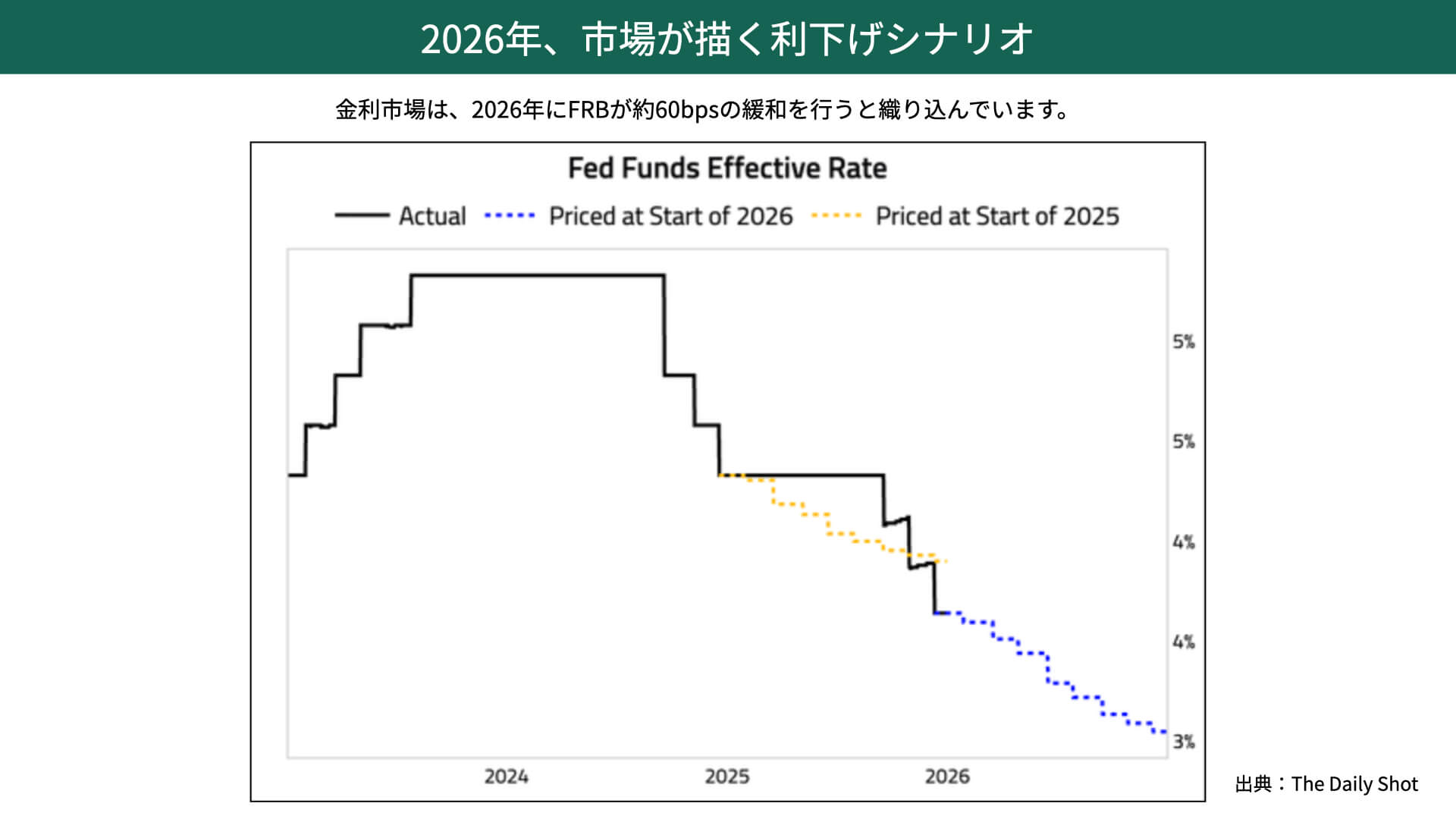 その結果、マーケットが描く今年の利下げは60bps、2回程度の利下げというのが市場の平均予想となっています。
