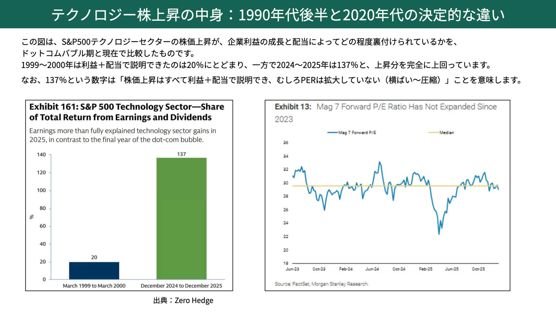 左の図表は、ITバブル、24年から25年にかけての上昇について、上昇要因を改めて分解した図表です。99年から2000年の上昇は、利益と配当で説明できるのは20%に留まっています。一方で、24年から25年は137%。利益と配当で説明できる部分が137%ということは、株価の上昇を完全に上回っている状況です。