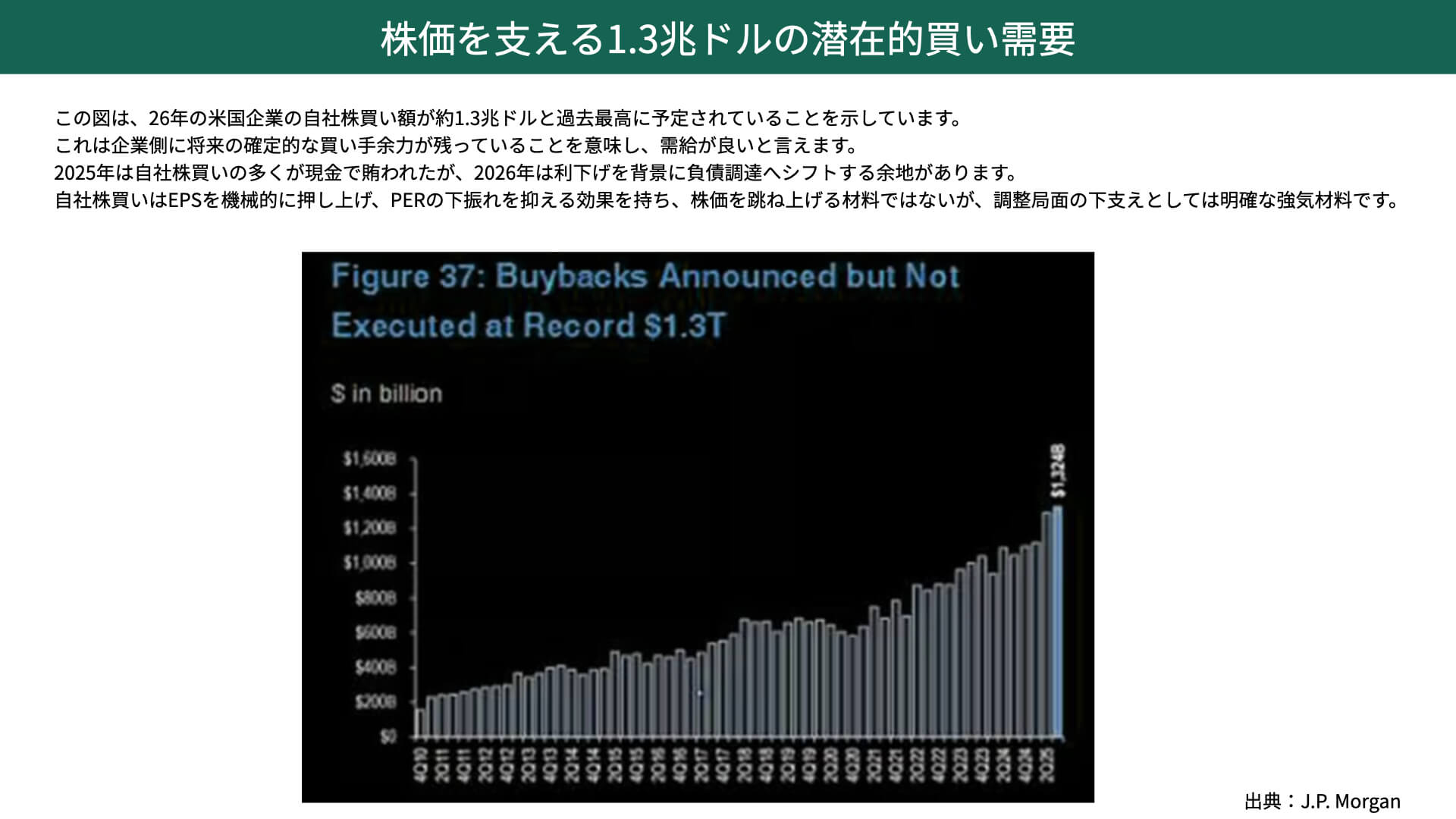 自社株買いは、株価を支える要因として知られています。26年は1.3兆ドル程度が予定されていることから、潜在的に企業が買い手に回る能力が非常に高いと、今年も期待されています。