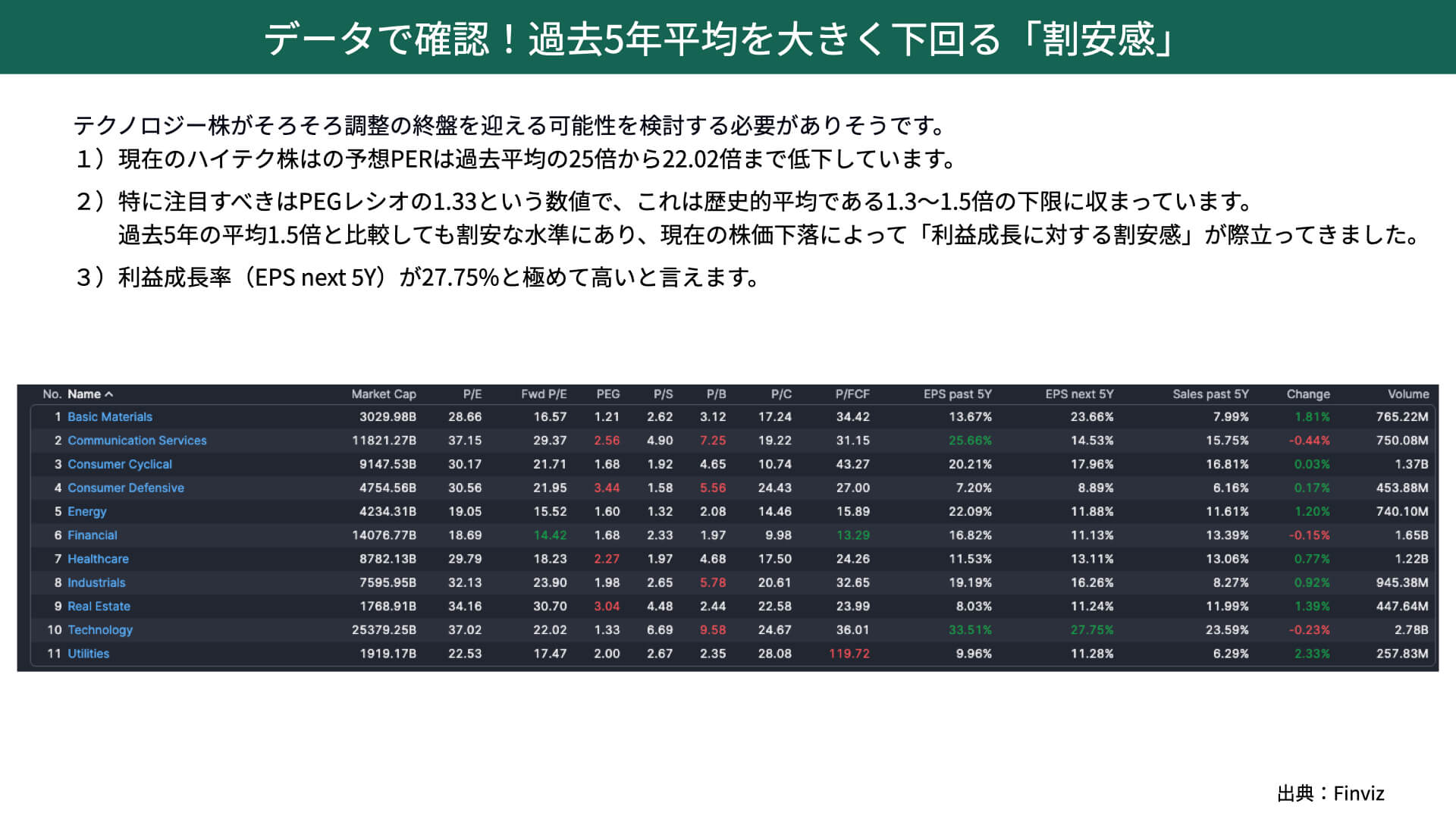 1.33という水準は、歴史的に見ても下限に近いです。過去5年間の平均1.5倍と比較しても、かなり割安な水準だと言えるでしょう。ここ最近の株価下落によって、テクノロジー株は利益成長に対して、相当な割安感が出てきていると言えます。