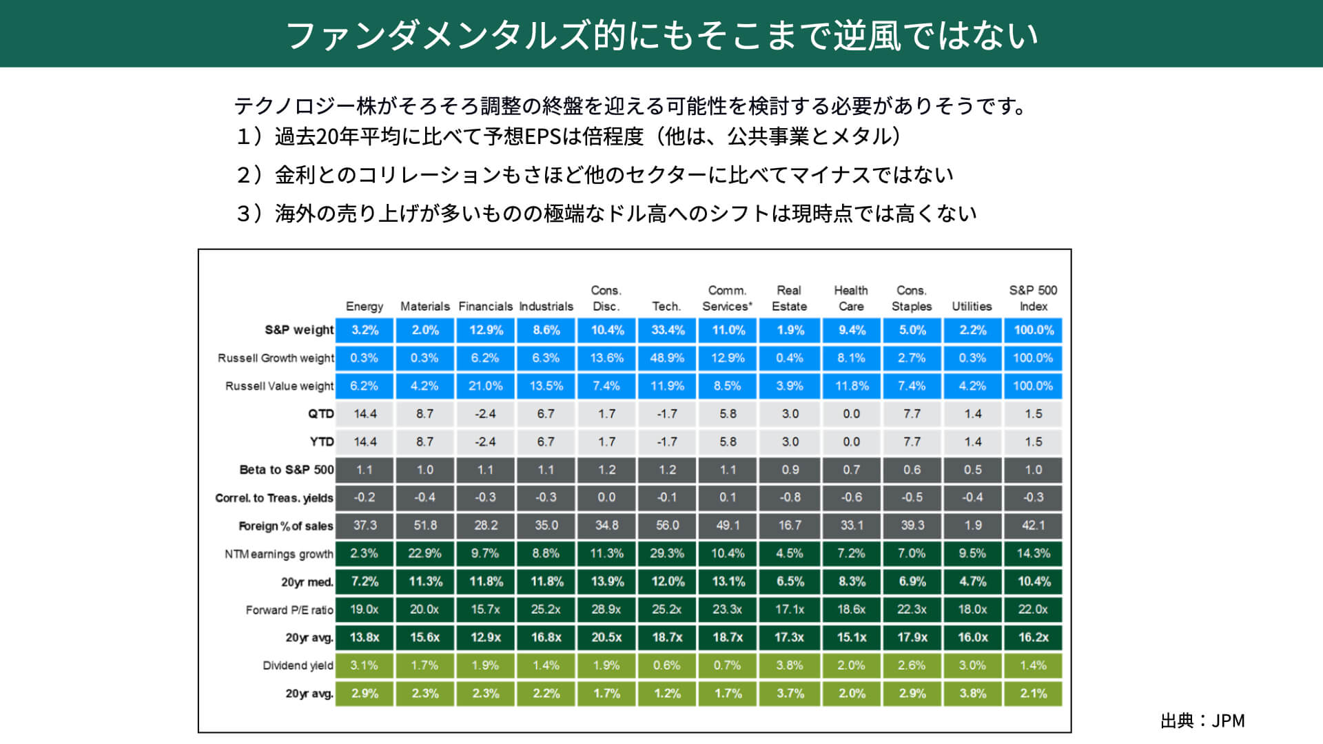 こうした文脈の中で、テクノロジー株は相対的にやや割安な水準まで下がってきている、という点も、ぜひ念頭に置いていただきたいと思います。