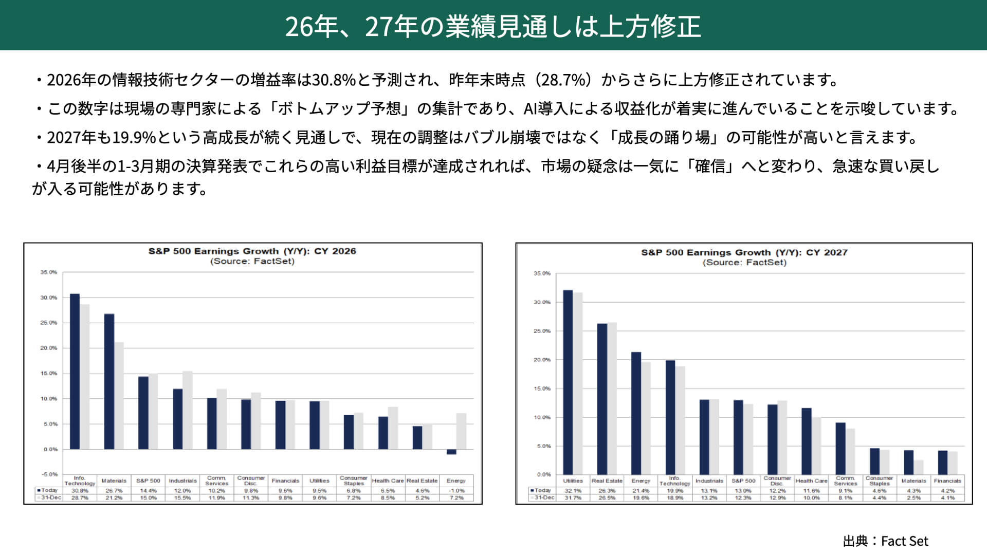2026年、テック企業は30.8%の利益成長が見込まれています。注目すべきは、昨年末時点で28.7%と見込まれていたものが、上方修正されていることです。
