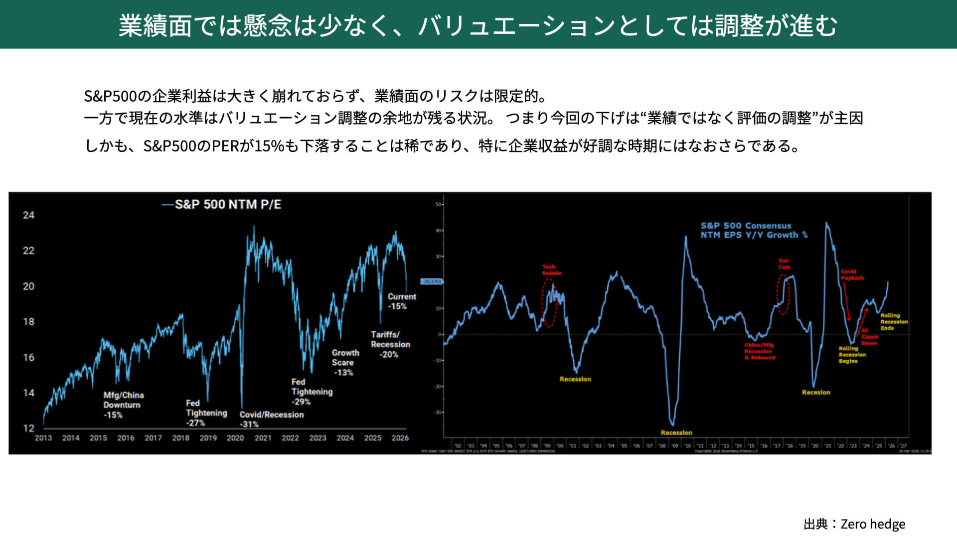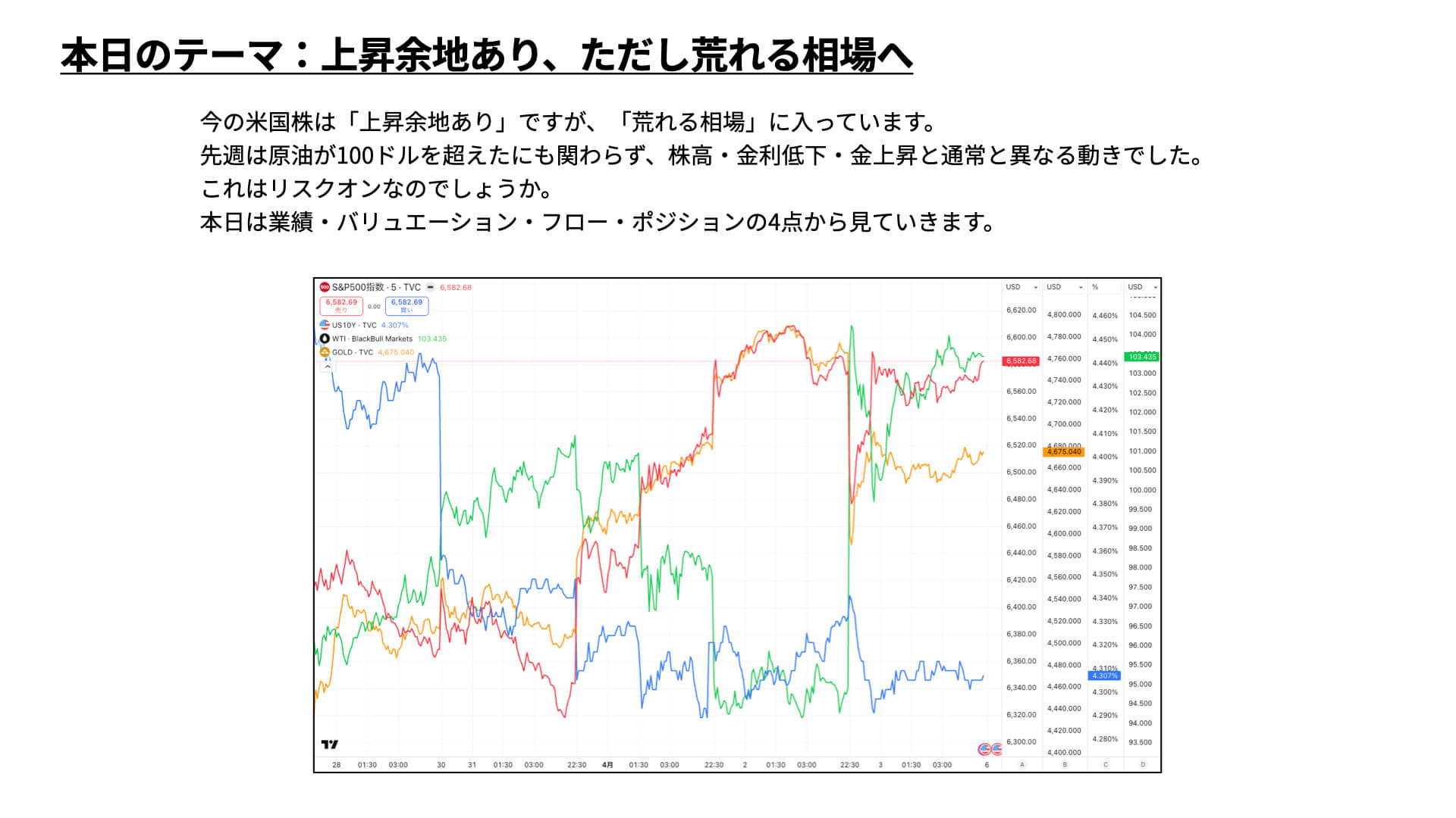 現在の米国株市場には上昇余地が十分にあると見ていますが、当面は荒れやすい相場になりそうです。本日は、業績、バリュエーション、フロー、ポジションの観点から、荒れる理由をお伝えしたいと思いますので、ぜひ最後までご覧ください。