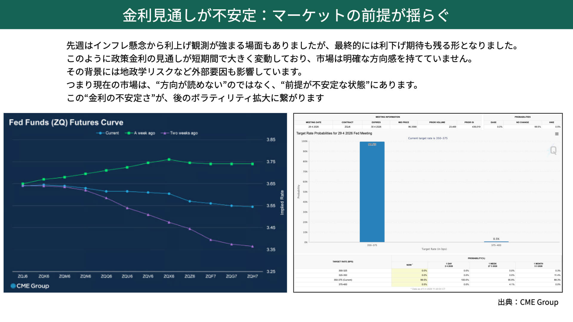 この2週間で、これだけ大きく金融政策の見通しが揺らぐのであれば、当然マーケットにもマイナスの影響があります。現在のマーケットは、明確な方向感を持てていないだけでなく、前提自体が不安定な状態にあります。この政策金利の不安定さが、後のボラティリティ上昇の土台にもなっているという点を、まず押さえておいていただきたいと思います。