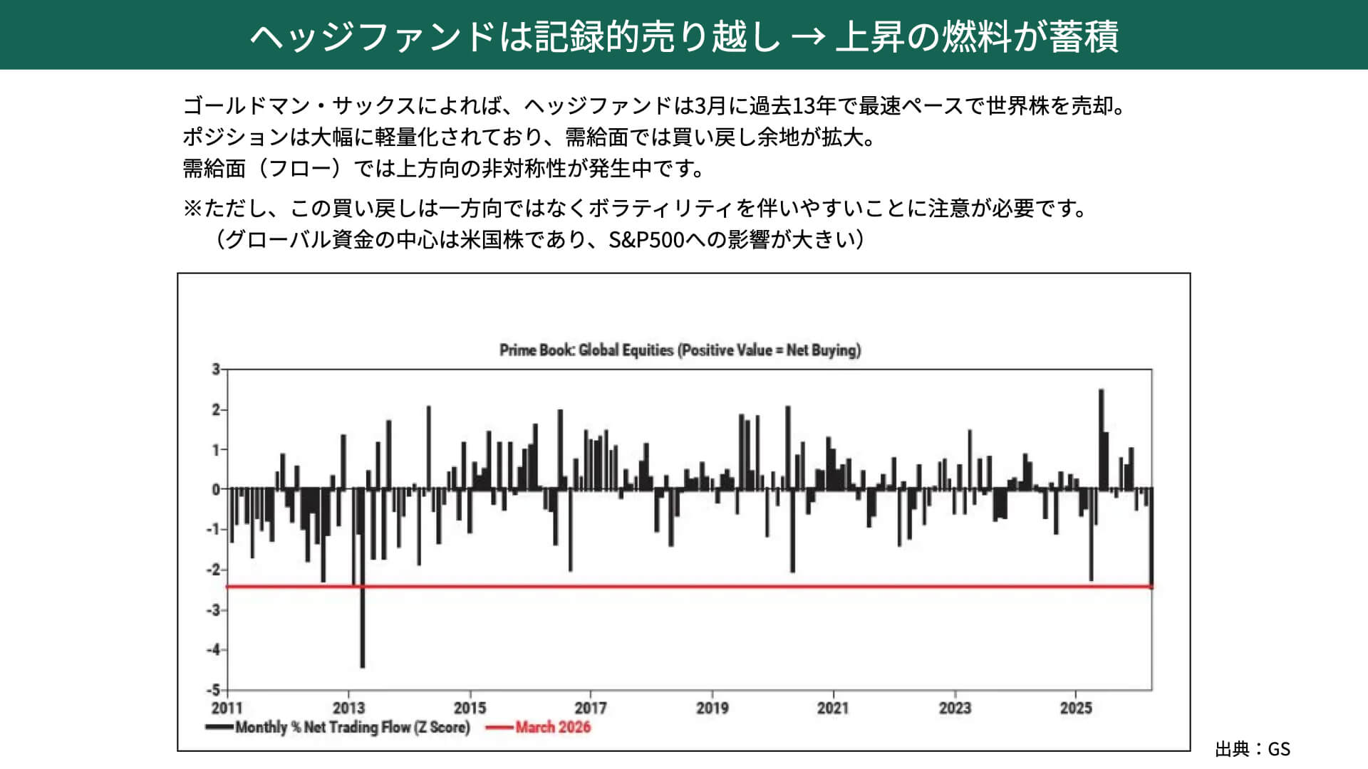 ゴールドマン・サックスによると、ヘッジファンドは3月に、過去13年で最速ペースで世界株を売却していることが分かりました。かなり売られていることが分かります。