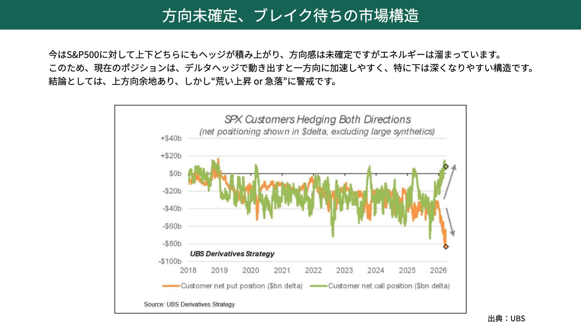 特に下方向に動いた場合は、下落が深くなりやすいという特徴があります。ヘッジファンドのポジション、バリュエーションの面から見れば、買い戻しが入りやすく、買える状態にはありますが、荒い展開、急落が十分に警戒されるポジションでもあることは、私たちは知っておく必要があります。