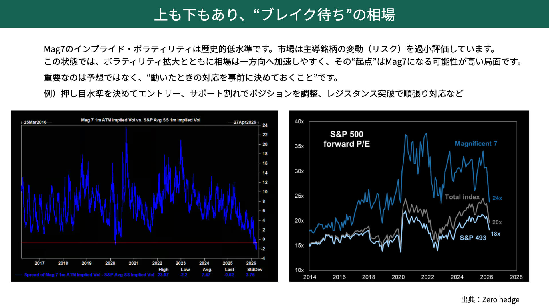 ボラティリティが高まりやすいM7が過小評価されているため、一方向へ加速しやすくなるということです。M7の動きが、S&P500がどちらかに大きくブレイクするきっかけになる可能性が高いと言えでしょう。