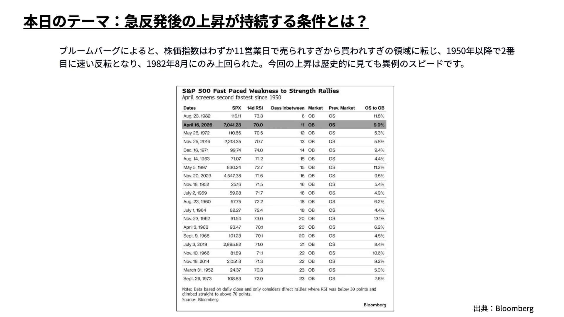 先週まで、米国株式は大きく反発しました。11日間で+9.9%の上昇は、1950年以降で2番目に早い反転となっています。