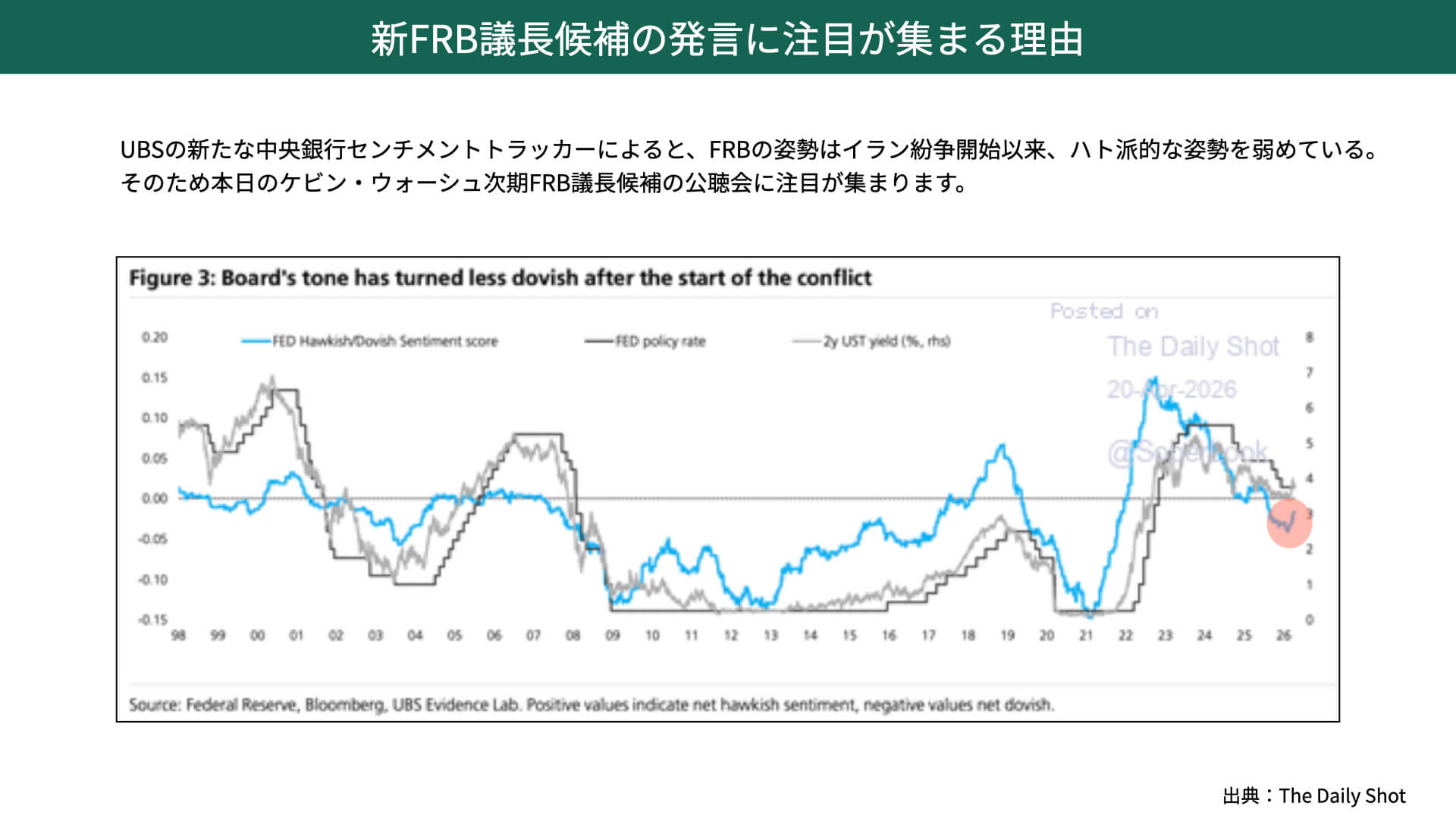 下の図表、UBSが出したFRBのセンチメントトラッカーをご覧ください。青のチャートが下がるとFRB全体がハト派的、上に転じるとタカ派であることを示しています。