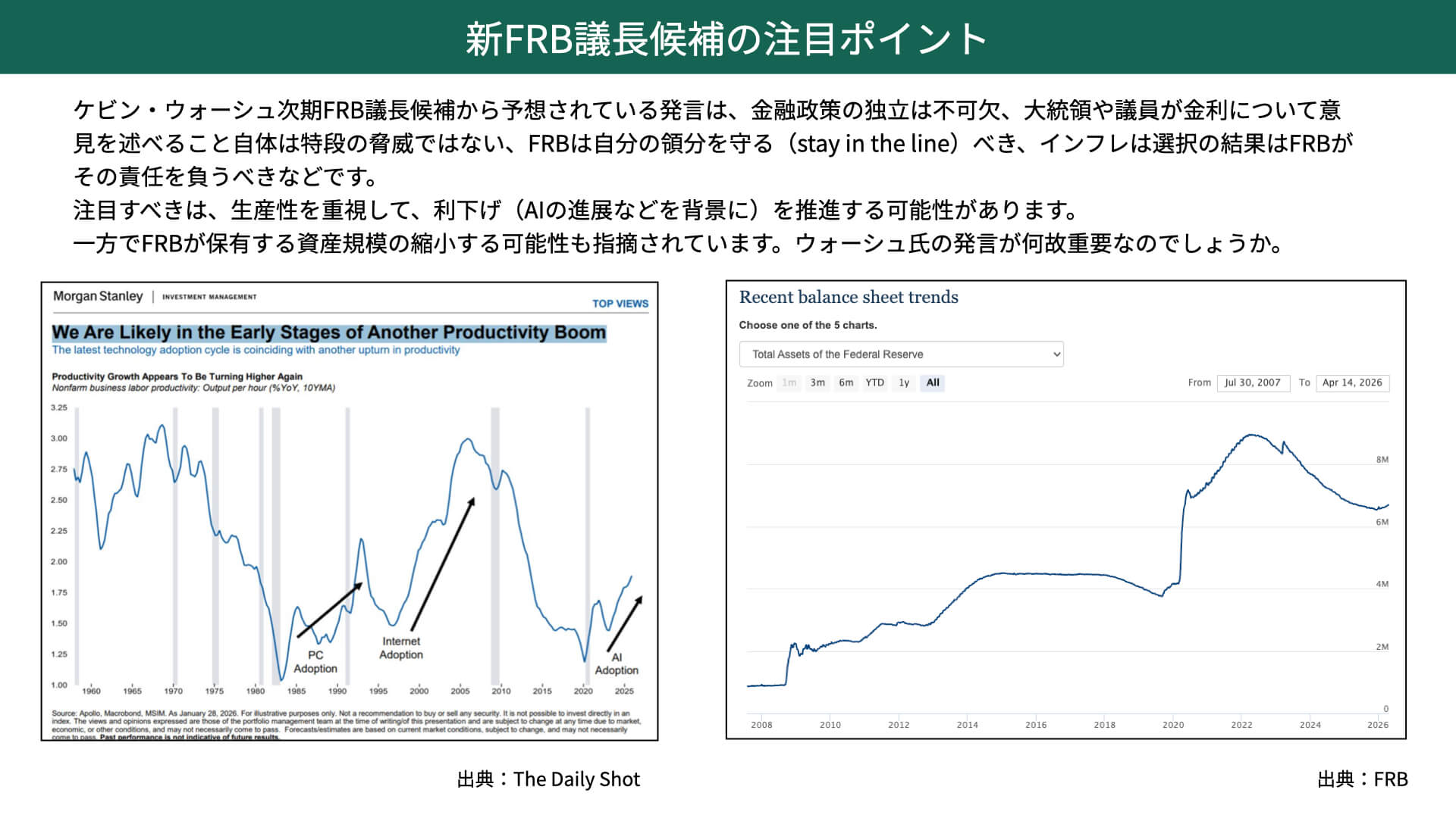 ウォーシュ氏は以前から、生産性が上がってくると、利下げを行う理由になると言っています。左の図表、生産性を表したチャートを見ても、PCが普及したとき、インターネットが普及したときには生産性が上がり、現在はAIの進展によって生産性が上がっている状況です。