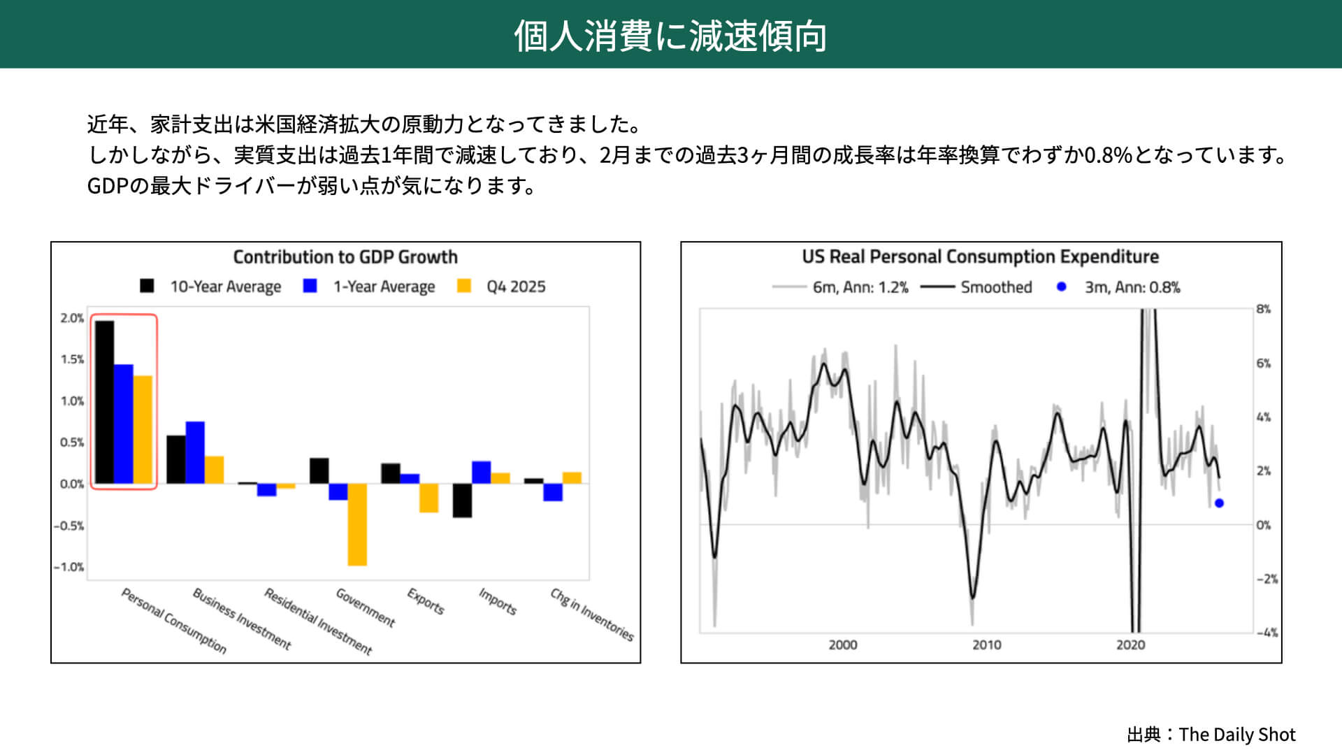 過去10年間、個人消費はGDPの約2%を占めていました。ただ、ここ1年は1.5%近くまで低下し、昨年の第4Qに限って言えば1.3%まで下がってきています。徐々に個人消費が減速しているのです。