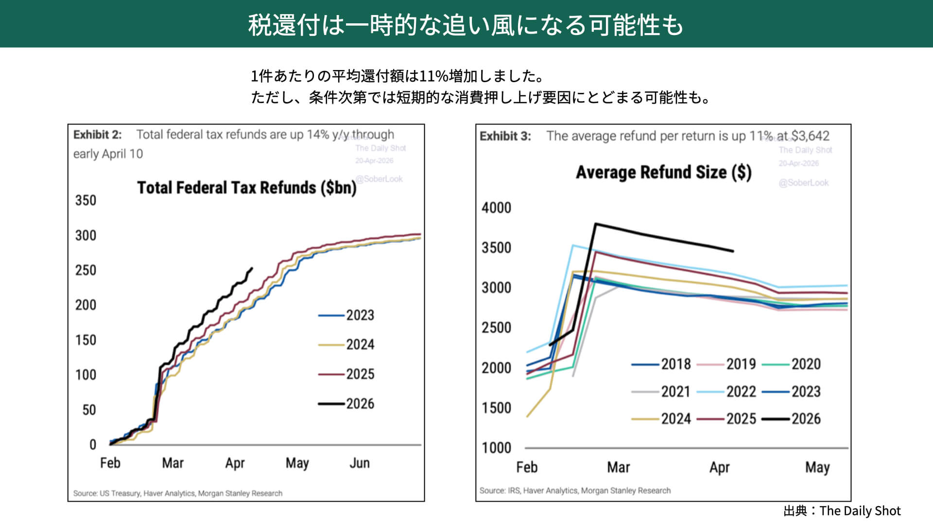 左の図表、2026年の黒いチャートのように、巨額の資金が早いスピードで返ってきています。右のグラフは、過去に比べてどのくらい額が増えているかを表しているのですが、平均給付額で11%も上昇しています。かなり懐が温まっているわけですから、個人消費も支出も増えてくるのではないか、心配はいらないのではないかと言われていたわけです。