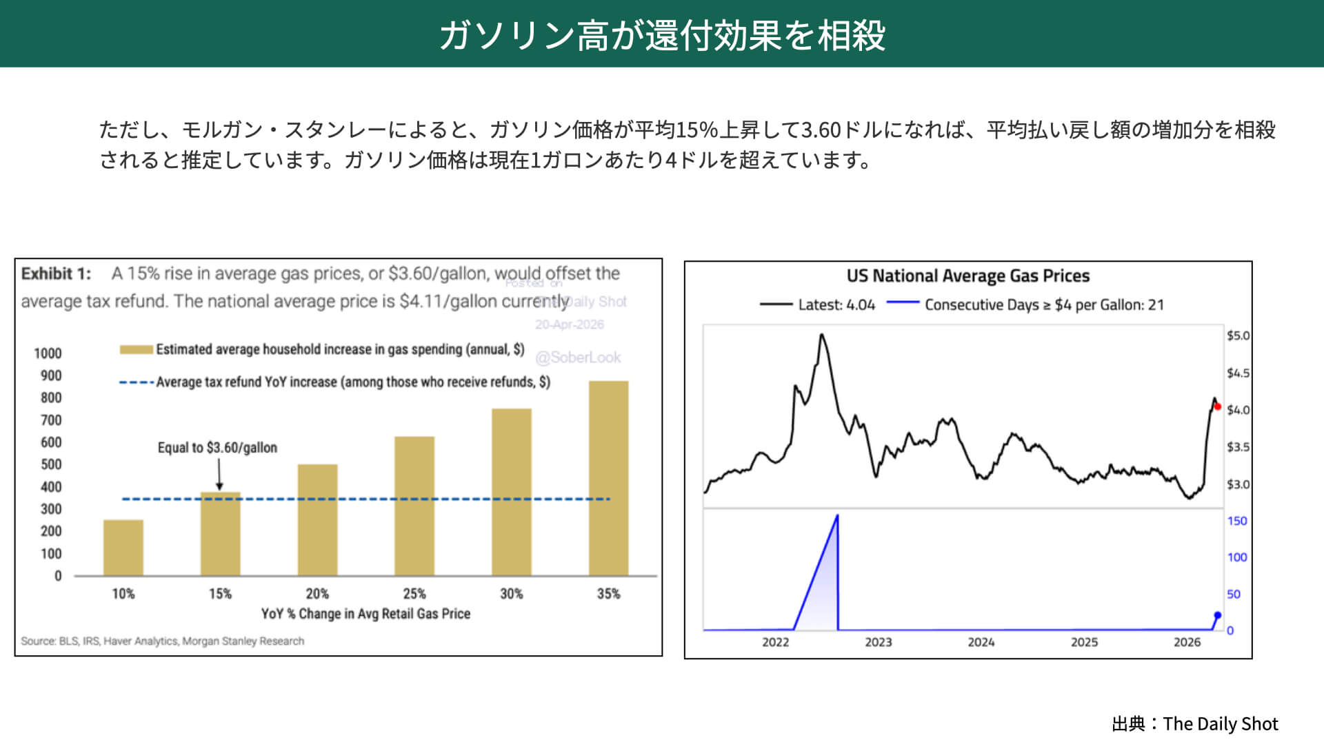 左の図表はモルガン・スタンレーが出した資料で、ガソリン価格が15%上昇、3.6ドルになると、巨額の税還付という平均的な払い戻しに対して、ガソリンの高騰が相殺する分岐点となることを示しています。