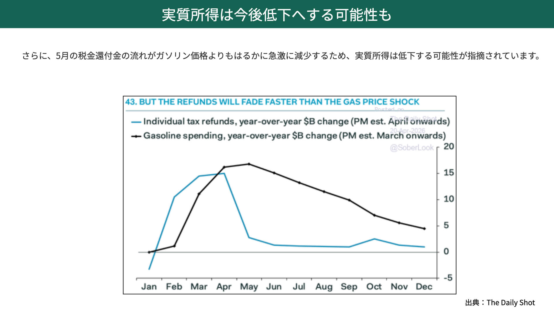 4月の時点までは税還付が上回っていましたが、これから税還付が落ち着いてきますから、実際には減ってくるわけです。対してガソリン価格は、情勢がどう転ぶか分からないとなれば、原油が高止まりして支出が増えていきます。
