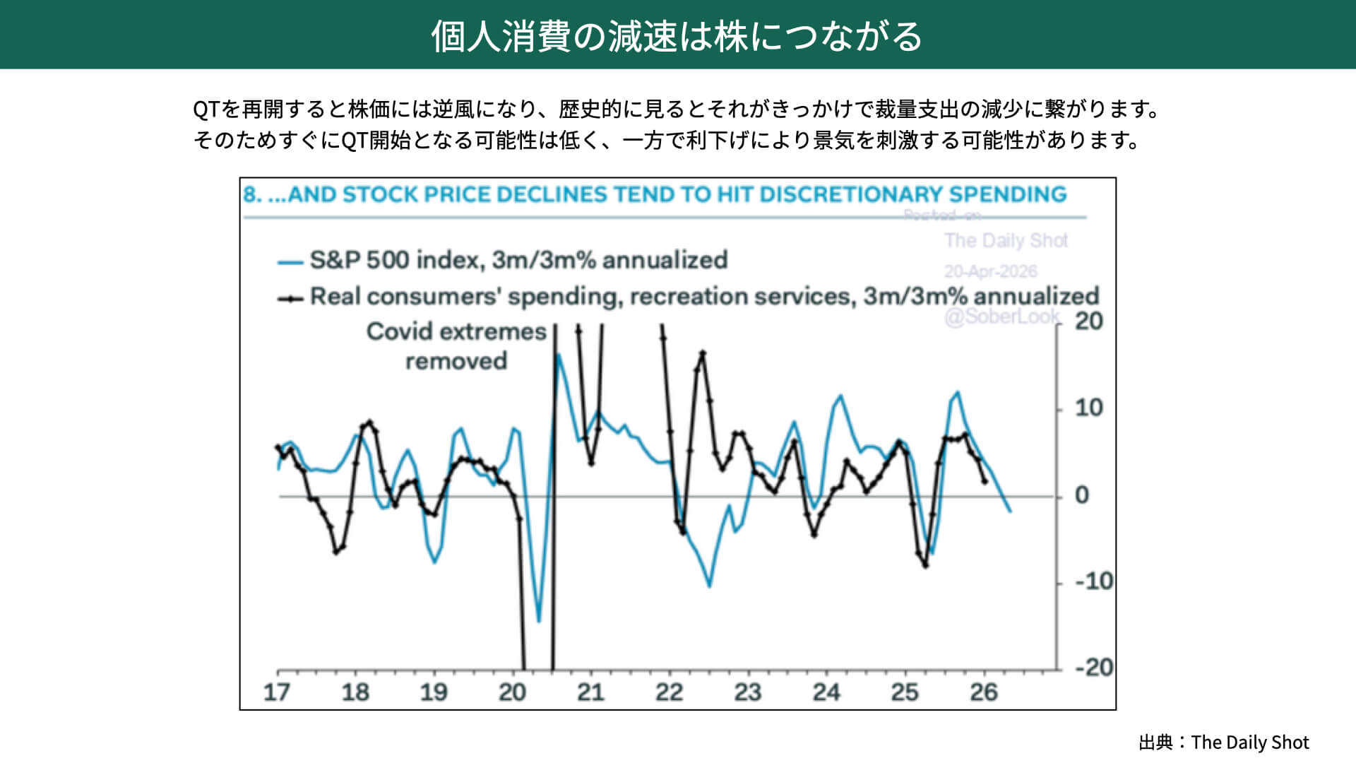 下のチャート、青がS&P500を表しますが、QTでS&P500が前年比で下がってくると、黒いチャートで示した個人の支出も相関性が高いため、下がってくると想定されます。