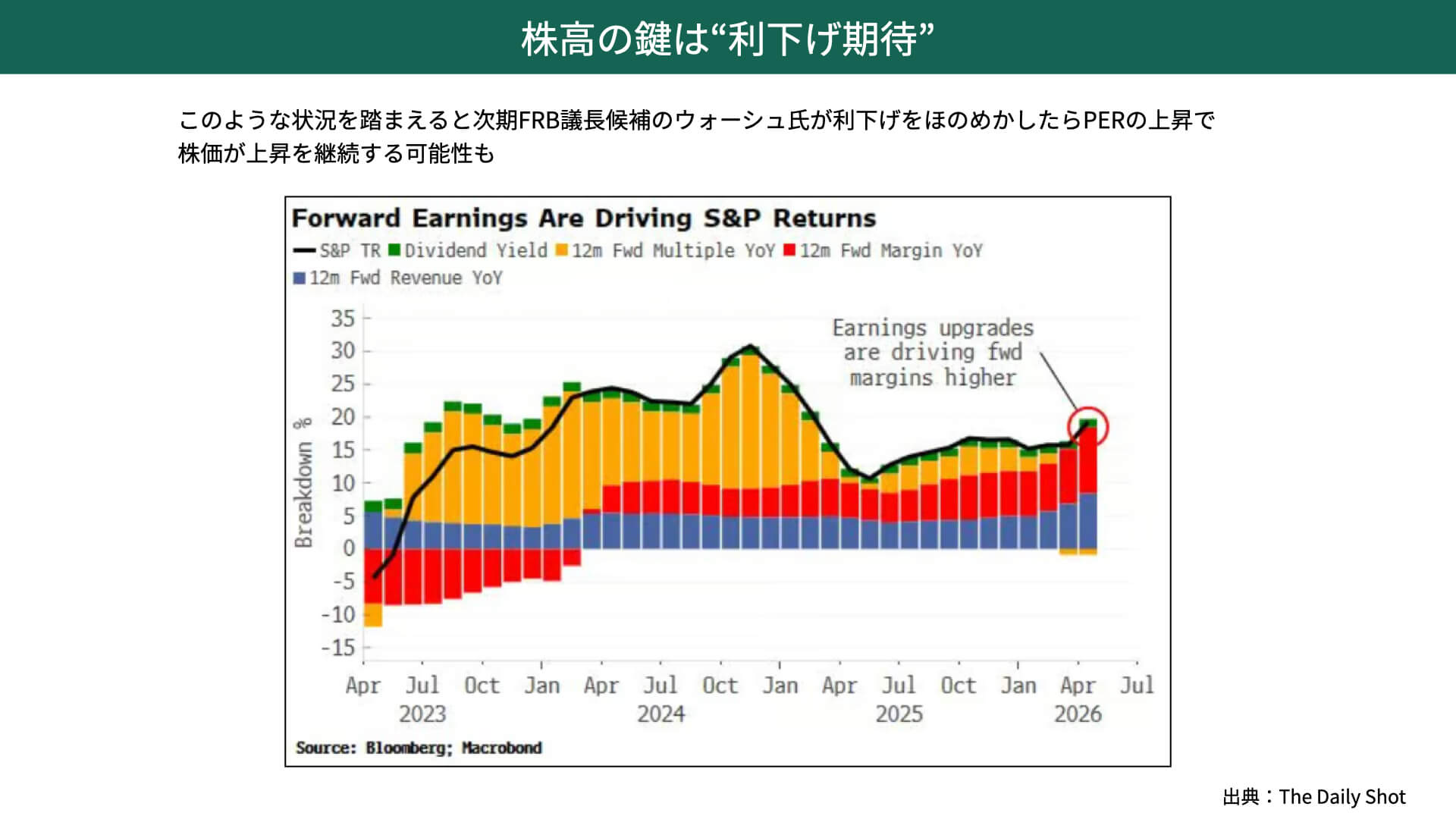 次に持続性です。ここ最近の株価上昇の構成要因としては、赤のマージンについては企業利益率の改善、青の売上の成長率、EPSの成長が大きくなっています。